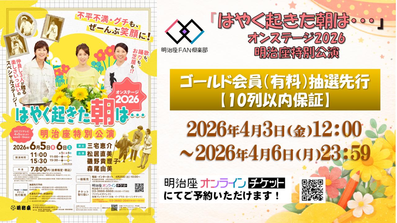 【受付中~4/6 (月)まで!】『はやく起きた朝は・・・』オンステージ2026 明治座特別公演◆ゴールド会員(有料)抽選先行【10列目以内保証】