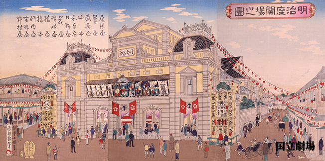 その後喜昇座は、久松座、千歳座と名前を変え、そして1893年(明治26年)に明治座として開場しました(下部絵図)。こちらの絵図、既に明治座の折詰弁当をお召し上がりの方は、どこかで見たことがあるのではないでしょうか…?実は、「彩り幕の内」「お江戸幕の内」の折箱に印刷されているのがこちらの絵図なんです!蓋を開ける前に、是非一度折箱の絵図をご覧になり、明治座の歴史に触れてみてください。