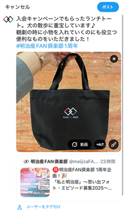 …お客様のX(旧Twitter)アカウントで、【明治座FAN倶楽部(@meijizaFANclub)の固定ポスト 】(※応募条件等が記載の1番上に出てくる投稿)を引用リポストしていただき、【#明治座FAN倶楽部1周年】を付けて投稿してください。