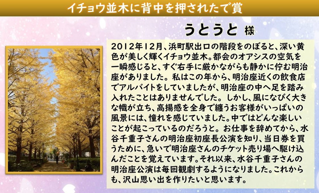 憧れを抱いていた明治座。アルバイトに向かいながら見ていた壮大なイチョウ並木の景色を、今度はお客様として見ていただけたことがとても嬉しいです。この景色に背中を押され、切符売場に足を踏み入れていただいた行動に賞をお届けいたします。