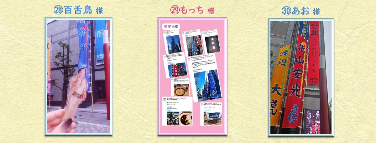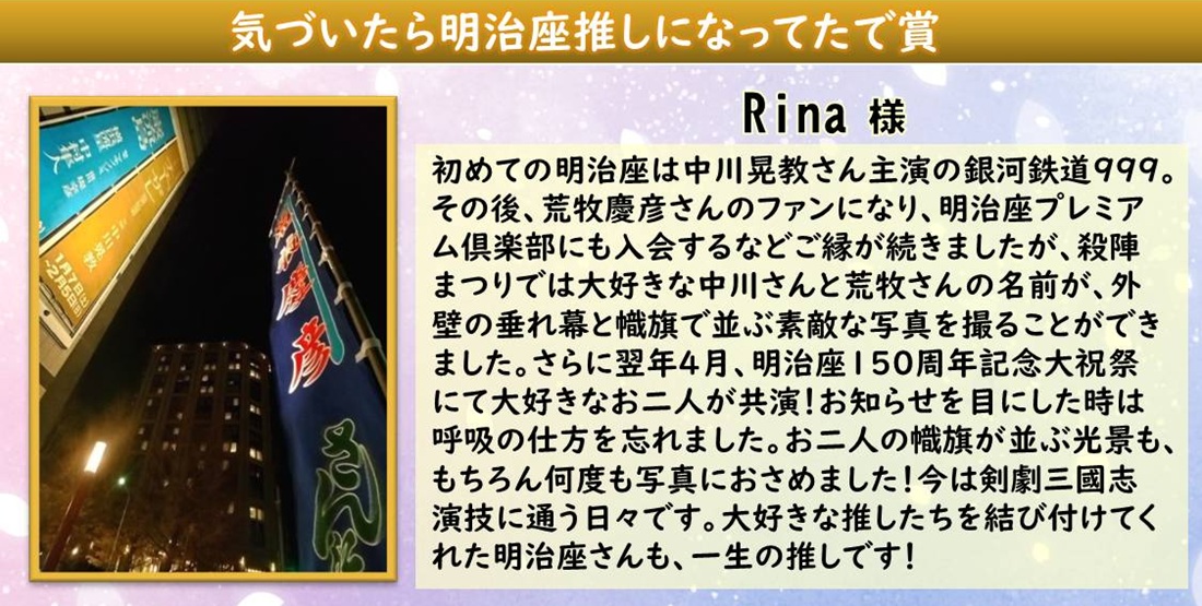 明治座で推しと推しが共演⁉、そして明治座推しになってくださったこと…!こちらもとても嬉しく、そんなのぼりと懸垂幕の共演のお写真に賞をお届けいたします!