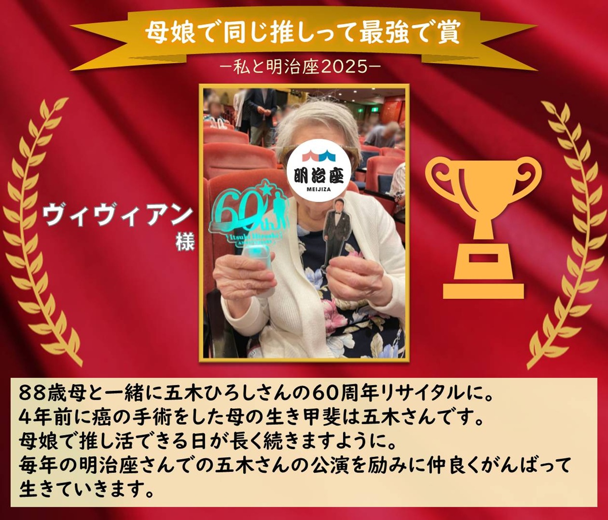 事務局員、満場一致の選出でした。母娘での推し活、奇跡的で感動的なエピソードだと感じました。“明治座での五木さんの公演を励みに仲良く生きていく“というコメントに、我々も特別な舞台をお届けせねば、と思いを新たにいたしました。お母様とまた明治座にお越しいただける日を楽しみにしております。