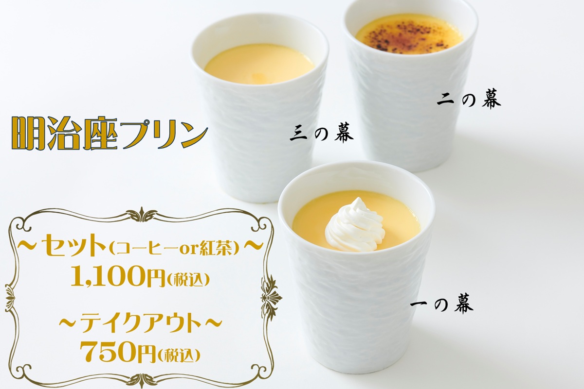 …特に卵にこだわって作った明治座プリン。味と製法が異なる「一の幕」、「二の幕」、「三の幕」の3種類のバリエーションがあります!