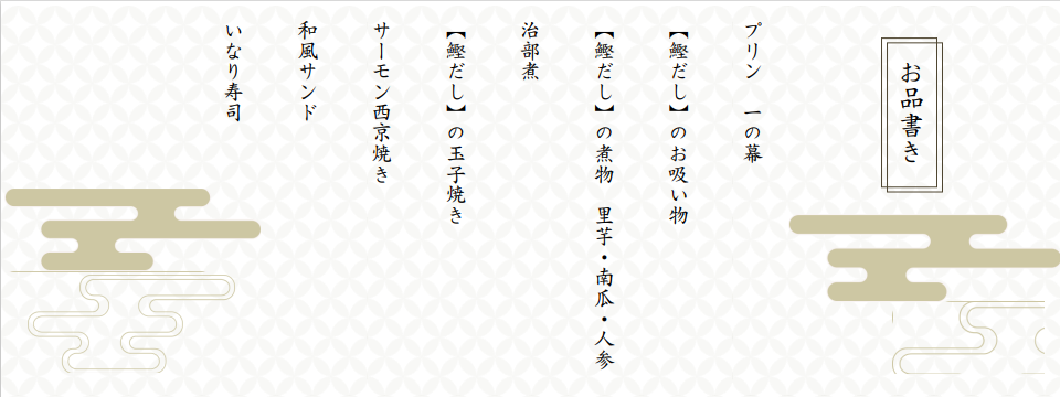 実は、明治座劇場内でのお弁当販売の他、料飲事業本部は東京と千葉の一部地域に折詰弁当やお重、ケータリングのお届けを行っております!