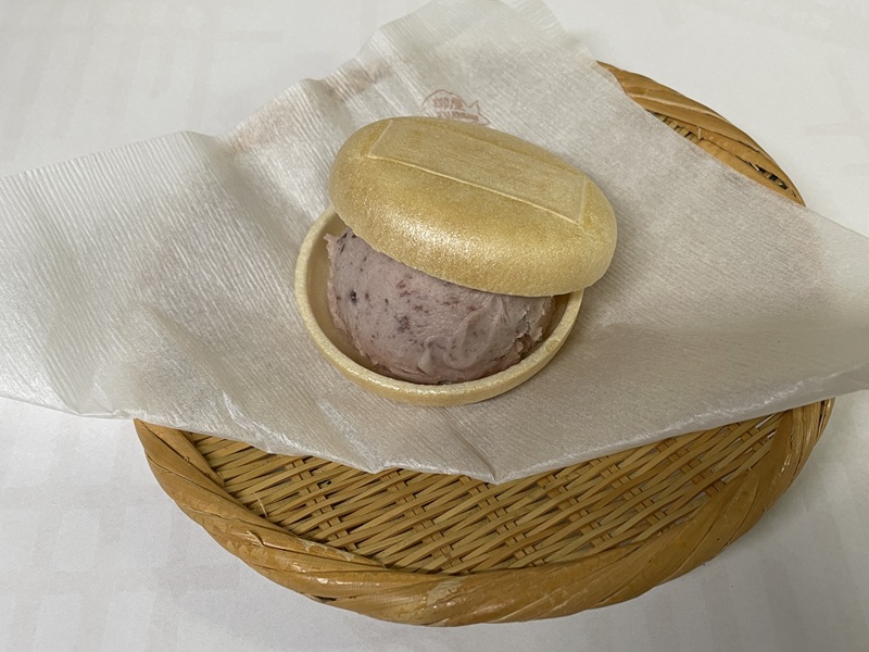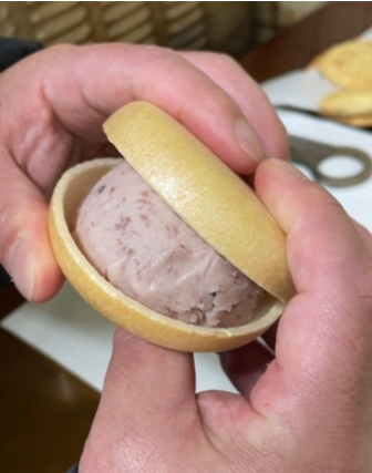 続いてアイス最中。最中をひと口食べると「パリッ」と良い音が!アイスは甘さ控えめで小豆がたっぷり。 アイスの冷たさと小豆の風味で口の中が満たされます。最中の良い食感と自然な甘さが忘れられなくなるような一品です!